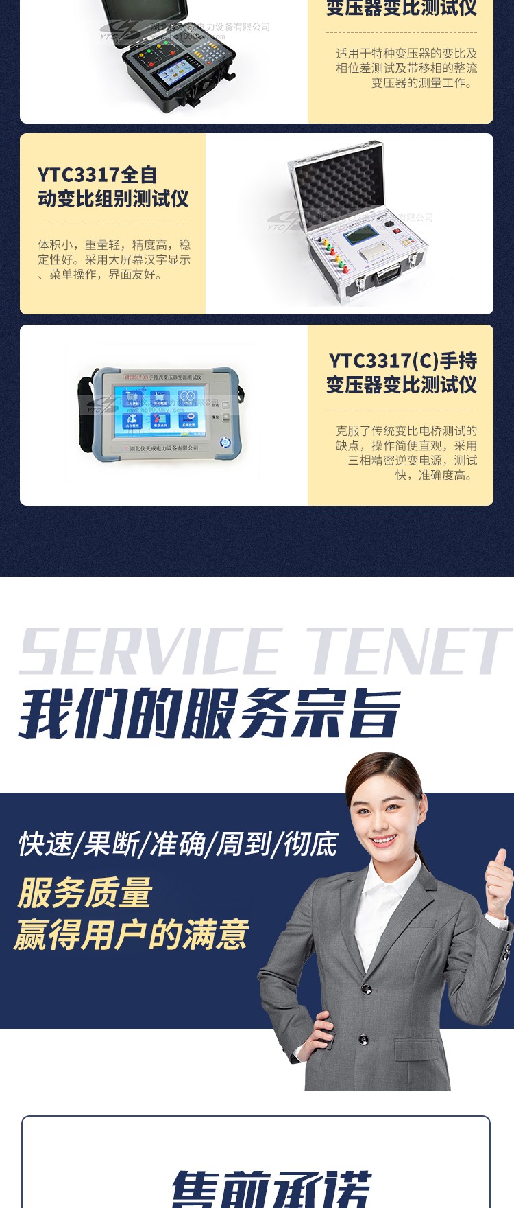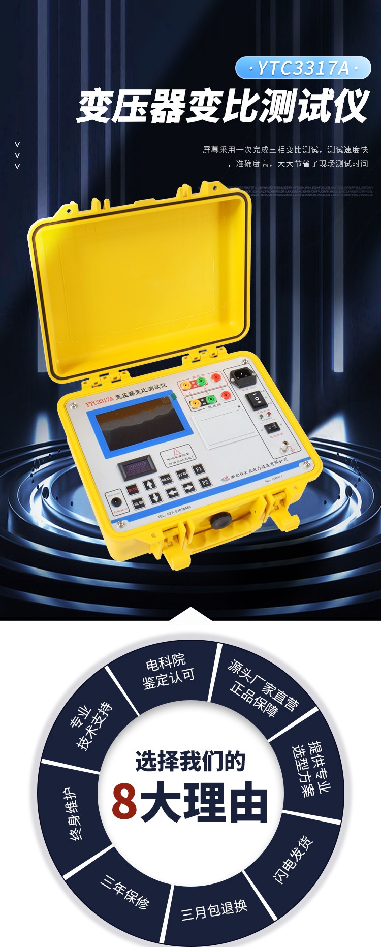 在電力變壓器的半成品、成品生產(chǎn)過(guò)程中,新安裝的變壓器投入運(yùn)行之前以及電力系統(tǒng)中變壓器運(yùn)行過(guò)程中根據(jù)國(guó)家電力部的預(yù)防性試驗(yàn)規(guī)程中,要求對(duì)運(yùn)行的變壓器定期進(jìn)行匝數(shù)比或電壓比測(cè)試。傳統(tǒng)的變比電橋操作繁瑣,讀數(shù)不直觀,且要進(jìn)行必要的換算,測(cè)試結(jié)果只為一相變比的值,三相變比值要逐相進(jìn)行測(cè)量。YTC3317A變壓器變比測(cè)試儀克服了傳統(tǒng)變比電橋測(cè)試的缺點(diǎn)。屏幕采用一次完成三相變比測(cè)試,測(cè)試速度快,準(zhǔn)確度高。大大節(jié)省了現(xiàn)場(chǎng)測(cè)試時(shí)間,為客戶(hù)的試驗(yàn)帶來(lái)了很高的效率。