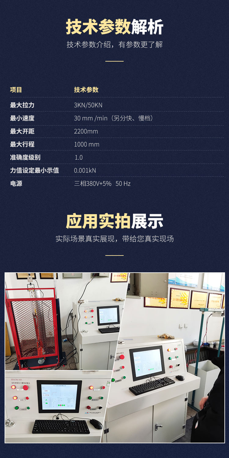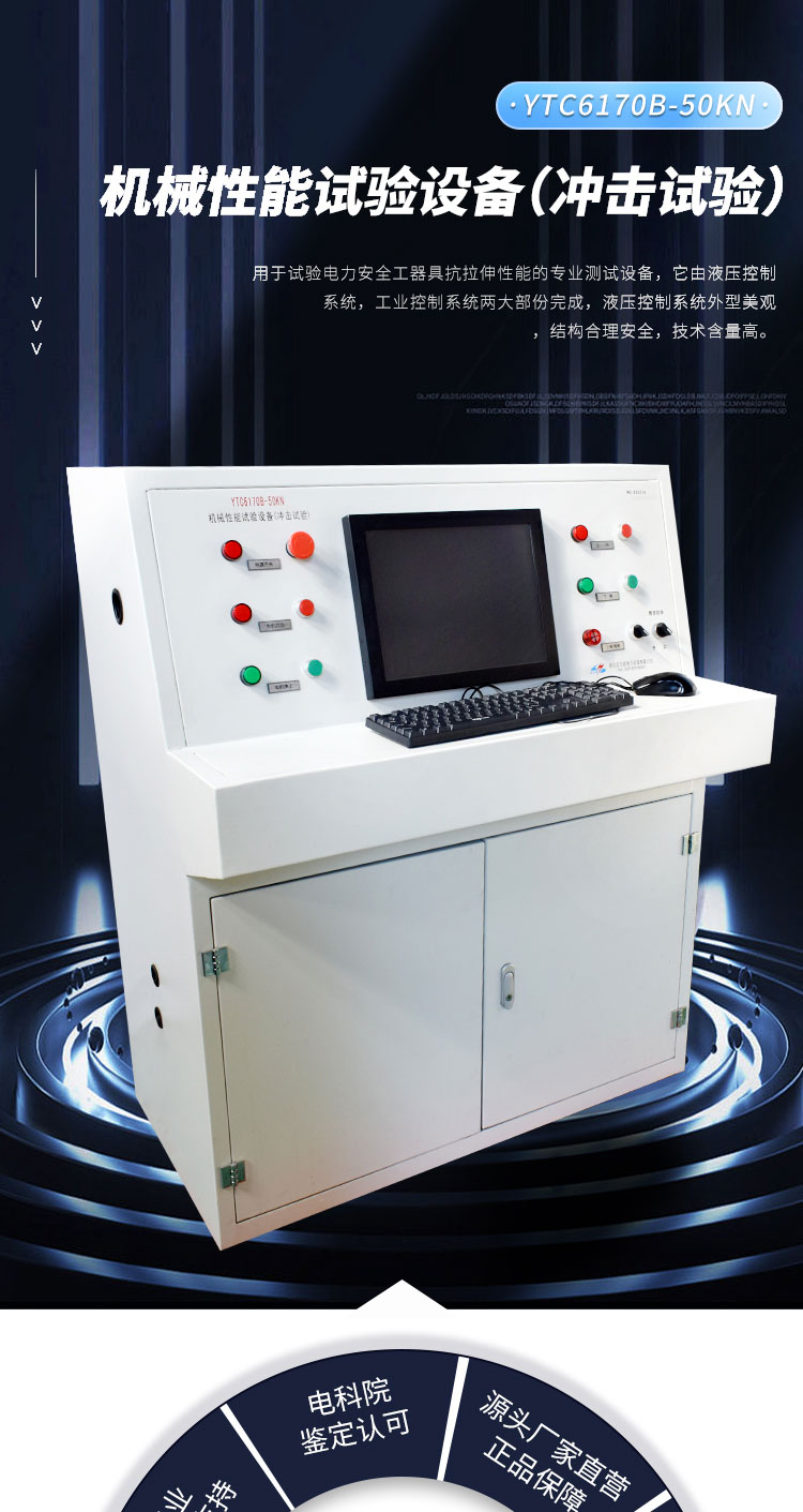 YTC6170B-50kN 機(jī)械性能試驗(yàn)設(shè)備(沖擊試驗(yàn))是按照《國家電網(wǎng)公司電力安全工作規(guī)程》的要求用于試驗(yàn)電力安全工器具抗拉伸性能的專業(yè)測(cè)試設(shè)備,它由液壓控制系統(tǒng),工業(yè)控制系統(tǒng)兩大部份完成,液壓控制系統(tǒng)外型美觀,結(jié)構(gòu)合理安全,技術(shù)含量高。工業(yè)控制系統(tǒng)采用工控機(jī)操作,集信號(hào)采集、轉(zhuǎn)換、處理、數(shù)據(jù)運(yùn)算、數(shù)據(jù)庫管理,實(shí)時(shí)顯示及執(zhí)行元件的控制等功能于一身,它廣泛適用于電力安全工器具(大腰帶、小腰帶、安全繩等)的安全檢測(cè),鋼纜、繩纜、葫蘆、雙鉤、滑車等各類起重工具的拉力試驗(yàn),還可以為線路、金具、絕緣瓷瓶等機(jī)械進(jìn)行靜載荷試驗(yàn)。