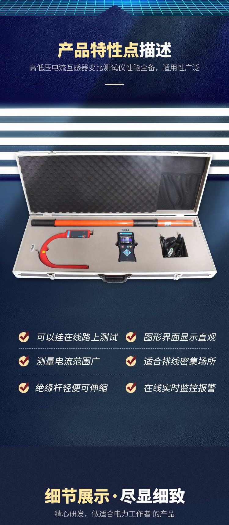 YTC2330A高低壓電流變比測試儀一次高壓鉤式檢測儀內(nèi)置雙層柔性線圈,輕便、精度高、量程廣、線性度好,連接伸縮絕緣桿,能在線測試35kV以下的裸導(dǎo)線或匯流母線,或110kV以下具有安全絕緣外皮的線纜的漏電流、電流、負(fù)荷等。無線接收數(shù)據(jù)直線距離約160米,電流量程為AC 0~5000A,測量導(dǎo)線或電纜最大外徑為Ф168mm,可測量母排最大尺寸為168mm×245mm。