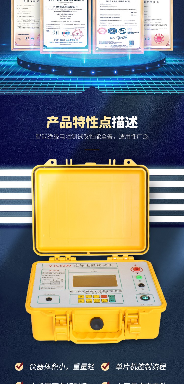 YTC5000智能絕緣電阻測(cè)試儀采用先進(jìn)的單片機(jī)控制流程,人機(jī)界面對(duì)話,攜帶方便,操作簡(jiǎn)單;內(nèi)附高性能大容量充電電池,交直流兩用,并設(shè)有欠壓保護(hù)和電池過(guò)充保護(hù)。本儀器可以自動(dòng)顯示當(dāng)前時(shí)間,保存歷史測(cè)試數(shù)據(jù)及時(shí)間,為試驗(yàn)人員提供了極大的方便。
