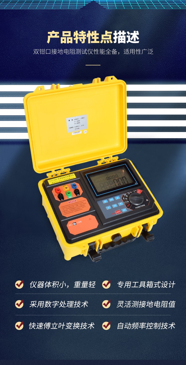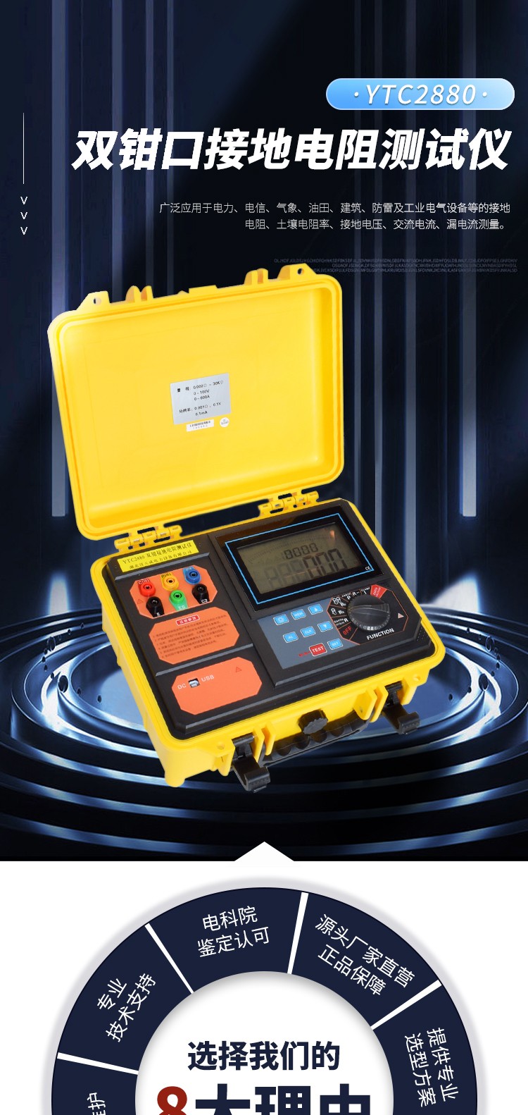YTC2880雙鉗接地電阻測試儀采用數(shù)字處理技術, 4線法、3線法和簡易2線法、選擇法、雙鉗法測量接地電阻,大口徑電流鉗設計,可測量使用大型接地引下線的接地系統(tǒng),可靈活準確測量單點和網(wǎng)狀接地等各種復雜接地情況的任意接地電阻值,并聯(lián)接地測量時無需斷開任何并聯(lián)接地電極,大大提高測量的方便性。導入FFT(快速傅立葉變換)技術、AFC(自動頻率控制)技術,具有獨特的抗干擾能力和環(huán)境適應能力,重復測試一致性強。